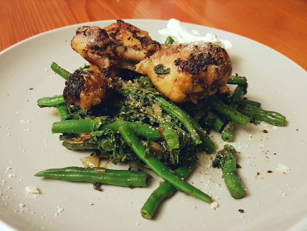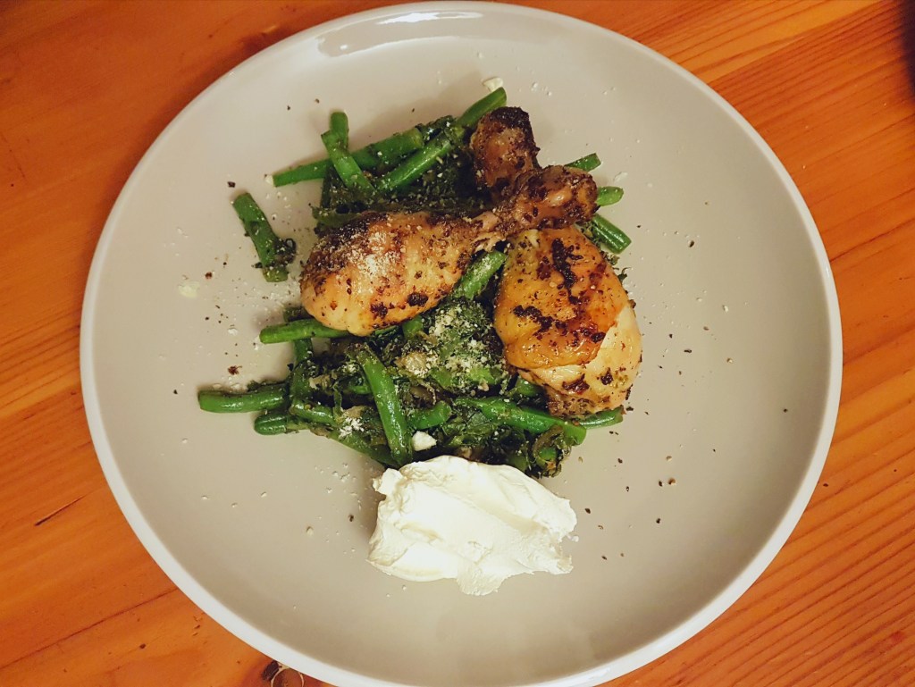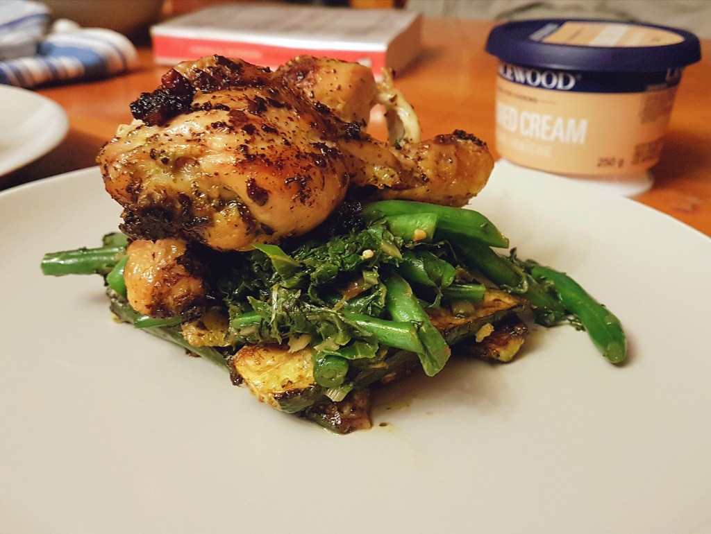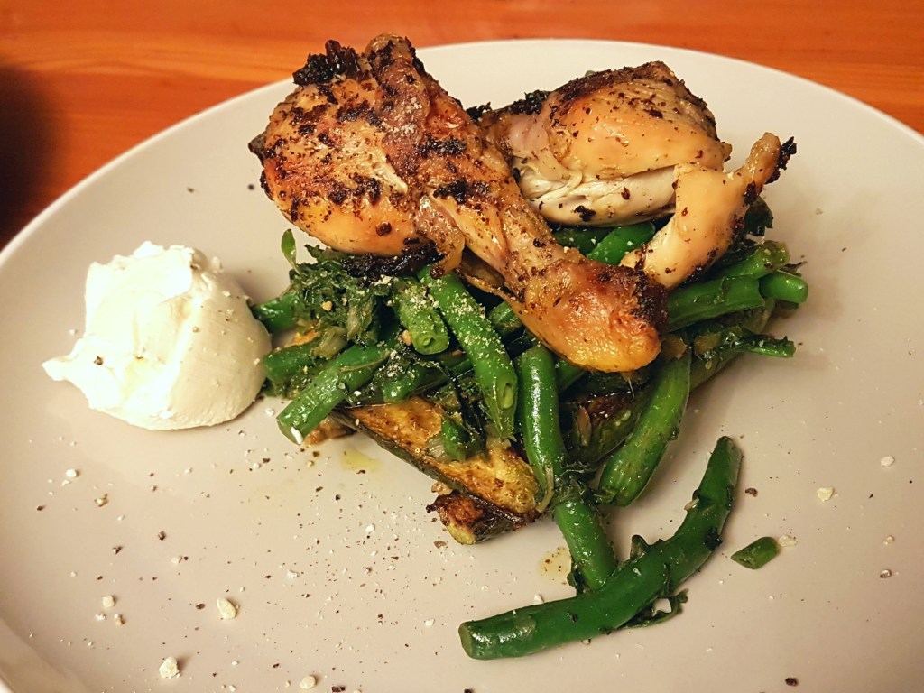 - Plate up! Start by creating a cross-hatch with your courgettes. Then plop two spoonfuls of the spinach and green beans on top of them. Finally add the chicken pieces on top.
