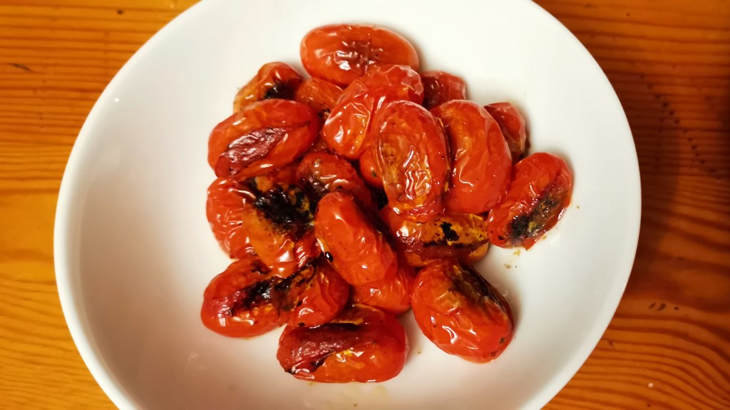 Heat olive oil in a frying pan and add your baby tomatoes when the pan is hot. Keep the lid on to ensure they don’t splatter hot juices all over you. Whirl them around for about 5 minutes or just until they’re literally starting to burst and blacken. Remove them from the pan and set aside for later.