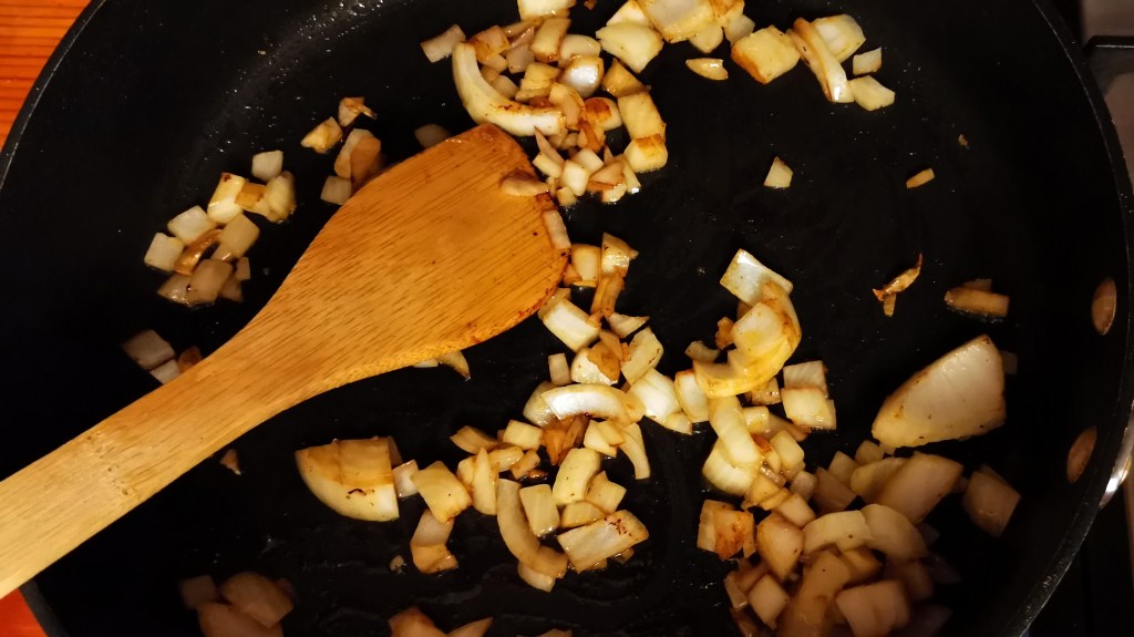 First, preheat the oven to 180°C and pop an ovenproof dish in there to heat up, too. Now, add your onions to the same frying pan that the tomatoes were in, lowering to medium heat. No need to add more oil.