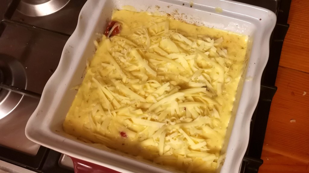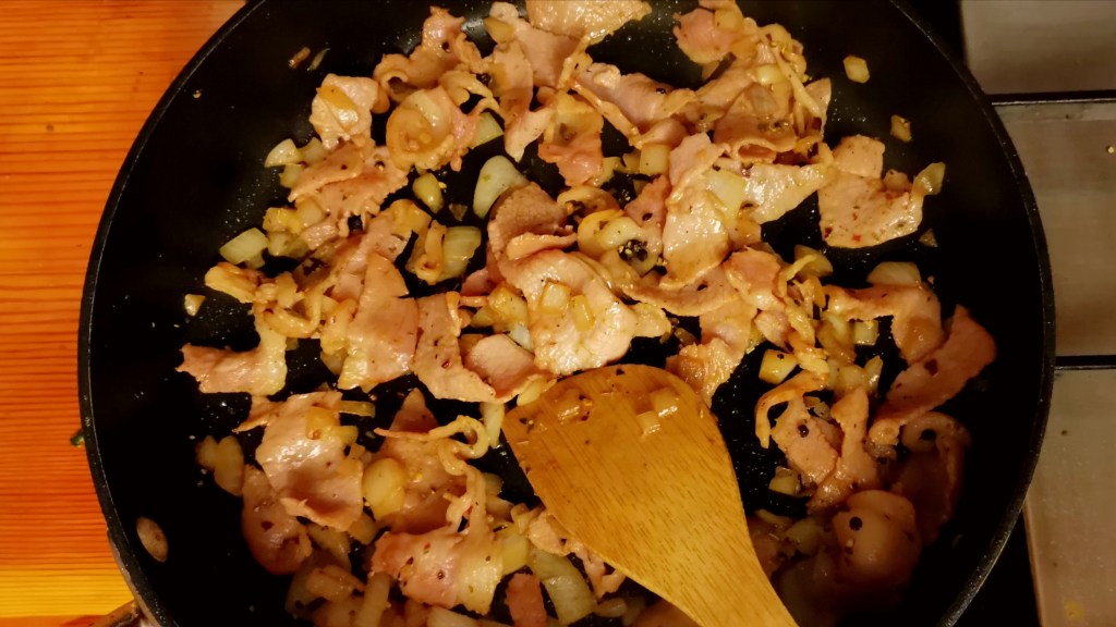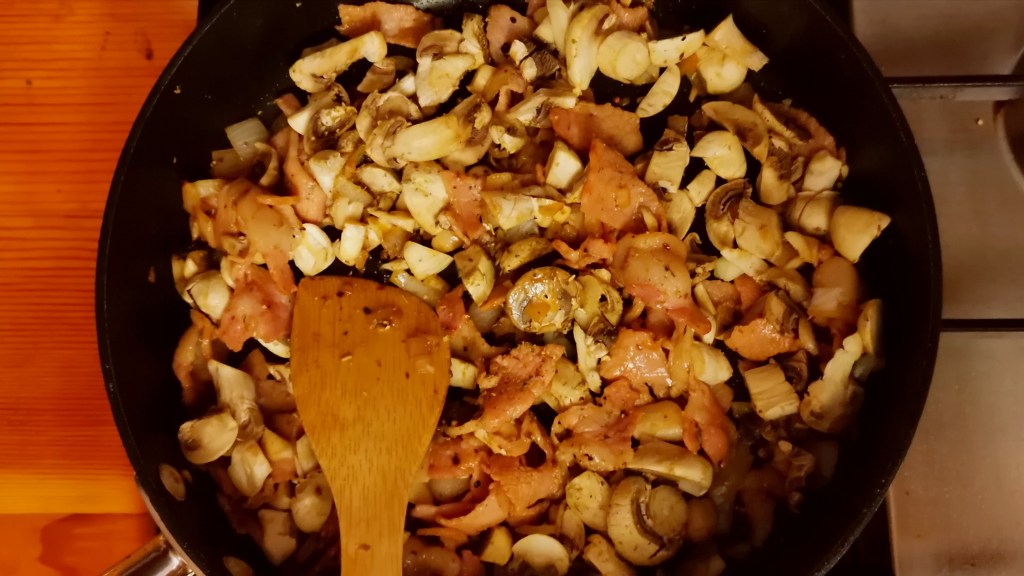 Get your hot dish from the oven and spoon the bacon and mushroom mix into it. Don’t worry if it sizzles when you add it to the hot dish.