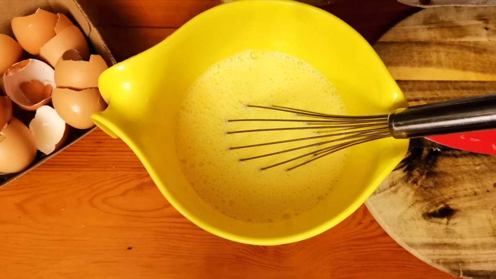 Whisk the 8 eggs and milk together. Add the salt to the mixture, too.