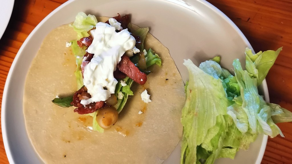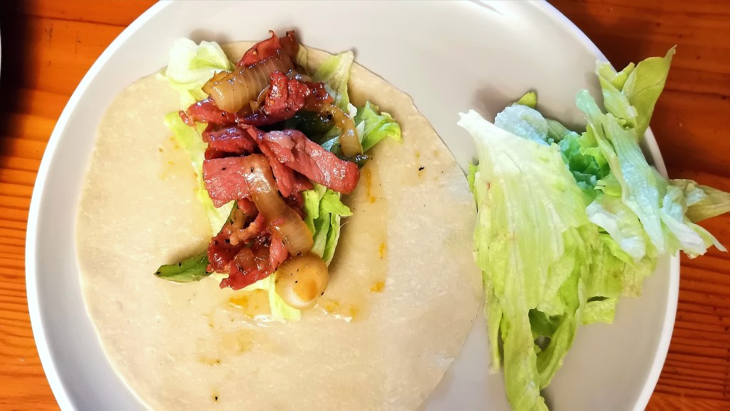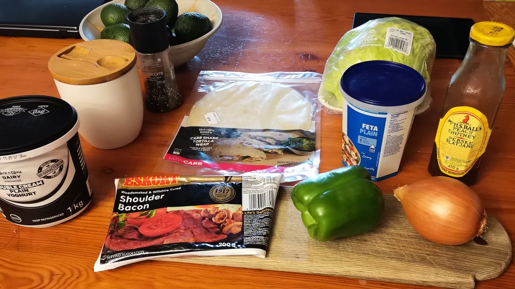 Naturally, I scavenged my pantry and bottom fridge drawer for filling ingredients. I found a pack of bacon, lettuce, a green pepper, an onion and double cream plain yoghurt to name a few. More than enough to make something tasty.