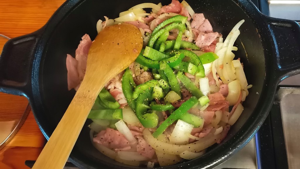 When the onion slices have sweated and the bacon starts to brown, add the green pepper. Season with salt and pepper.
