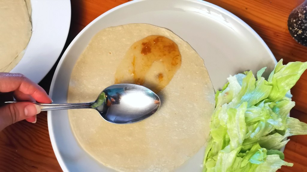- Lay the warm tortilla on a plate and spread a tablespoon of chutney all over it.
