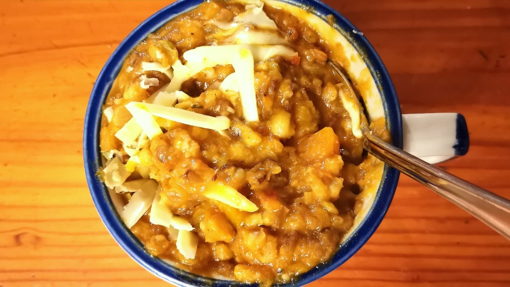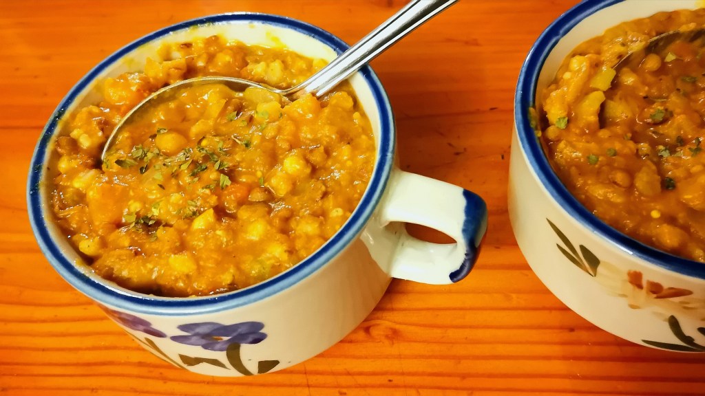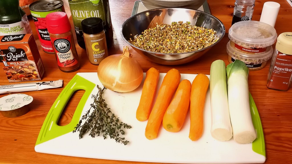 This lentil soup has a little bite to it because of the addition of chilli flakes, cayenne pepper and Rajah’s mild & spicy curry powder. If heat’s not your thing at all, simply replace or omit those ingredients.