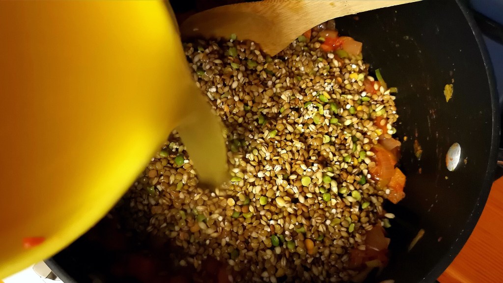 Add the lentils and soup mix. Then pour the veggie stock over it. Add a cup of water too.