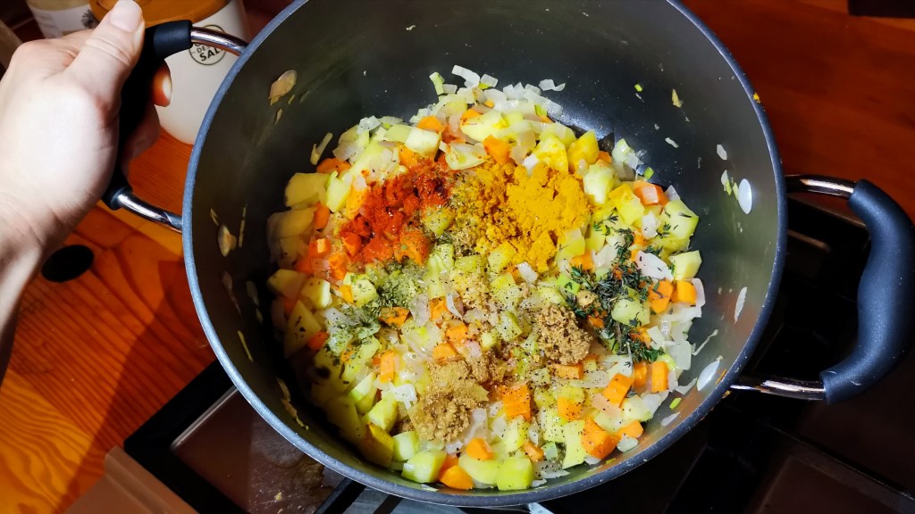 - Add the sweet potato and carrot cubes once the onion has softened.