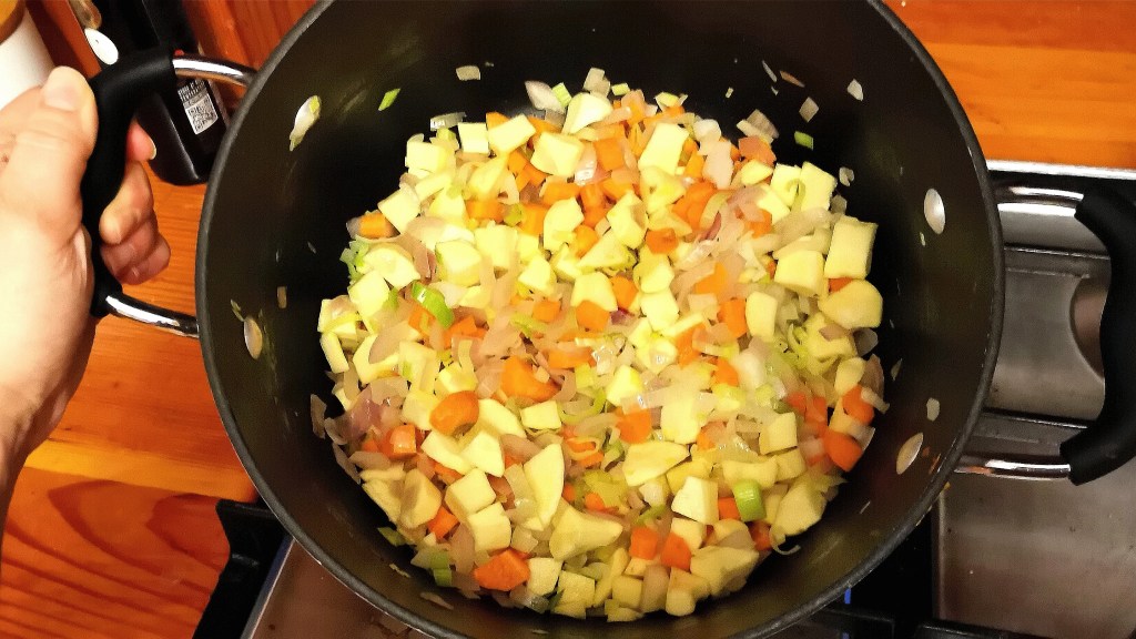 - Sauté the onion and leek in a big pot over medium heat.