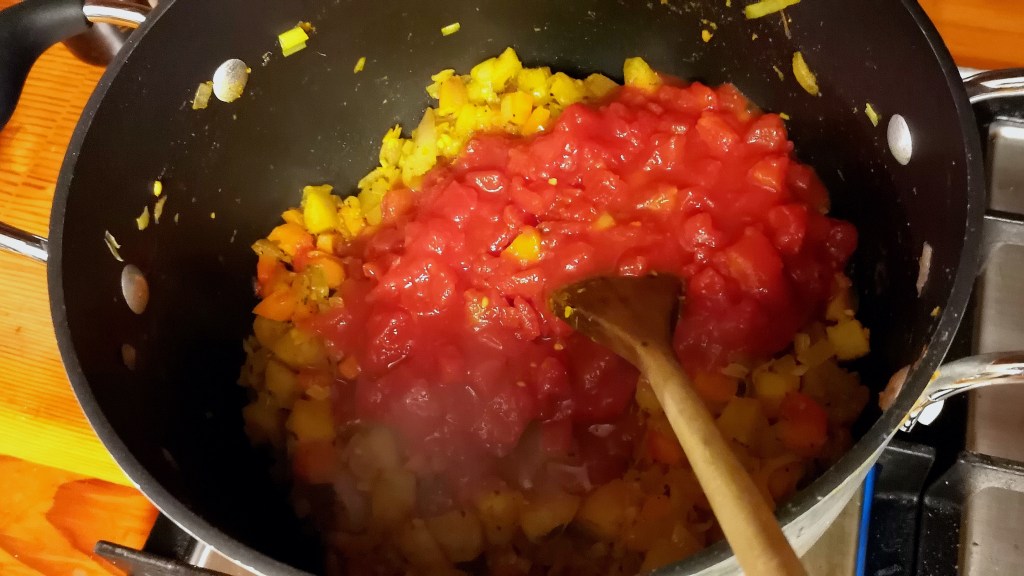 - Stir for 30 seconds and then add the canned tomatoes.
