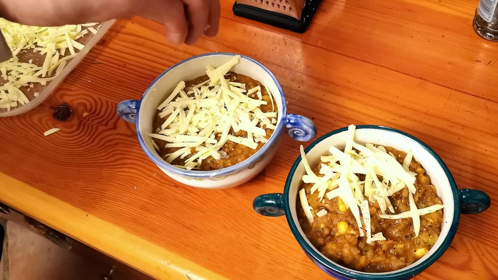 We like to sprinkle some grated white Cheddar on top.