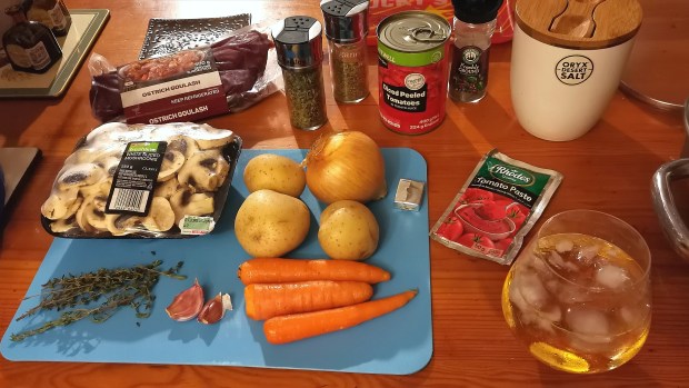 Throughout lockdown, Vincent and I have been avoiding leaving the house for any reason whatsoever so we’ve been using an app called Bottles to get groceries delivered to our home. Sometimes items are out of stock and you’re given the opportunity to swap the out of stock ones for different items. And so a pack of ostrich goulash arrived at my door.