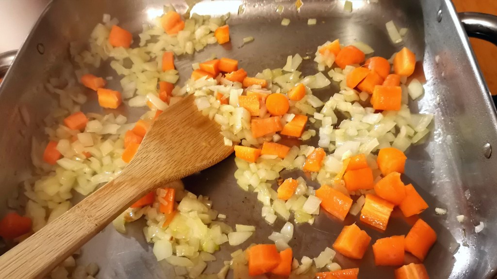 - Once the onions are translucent, add the potatoes and sauté for 5 minutes.