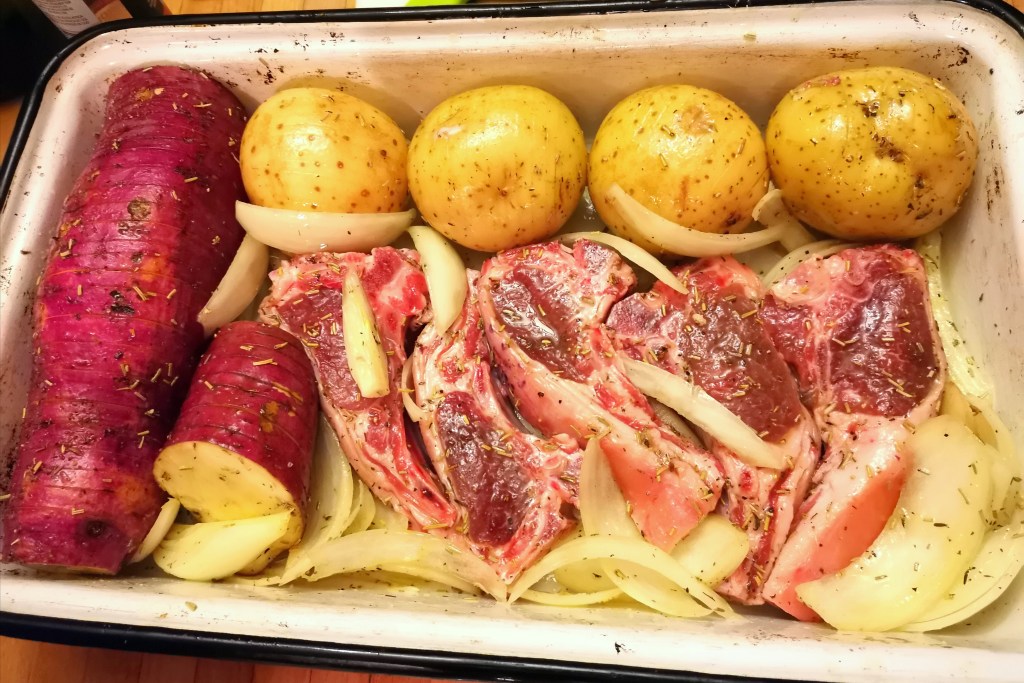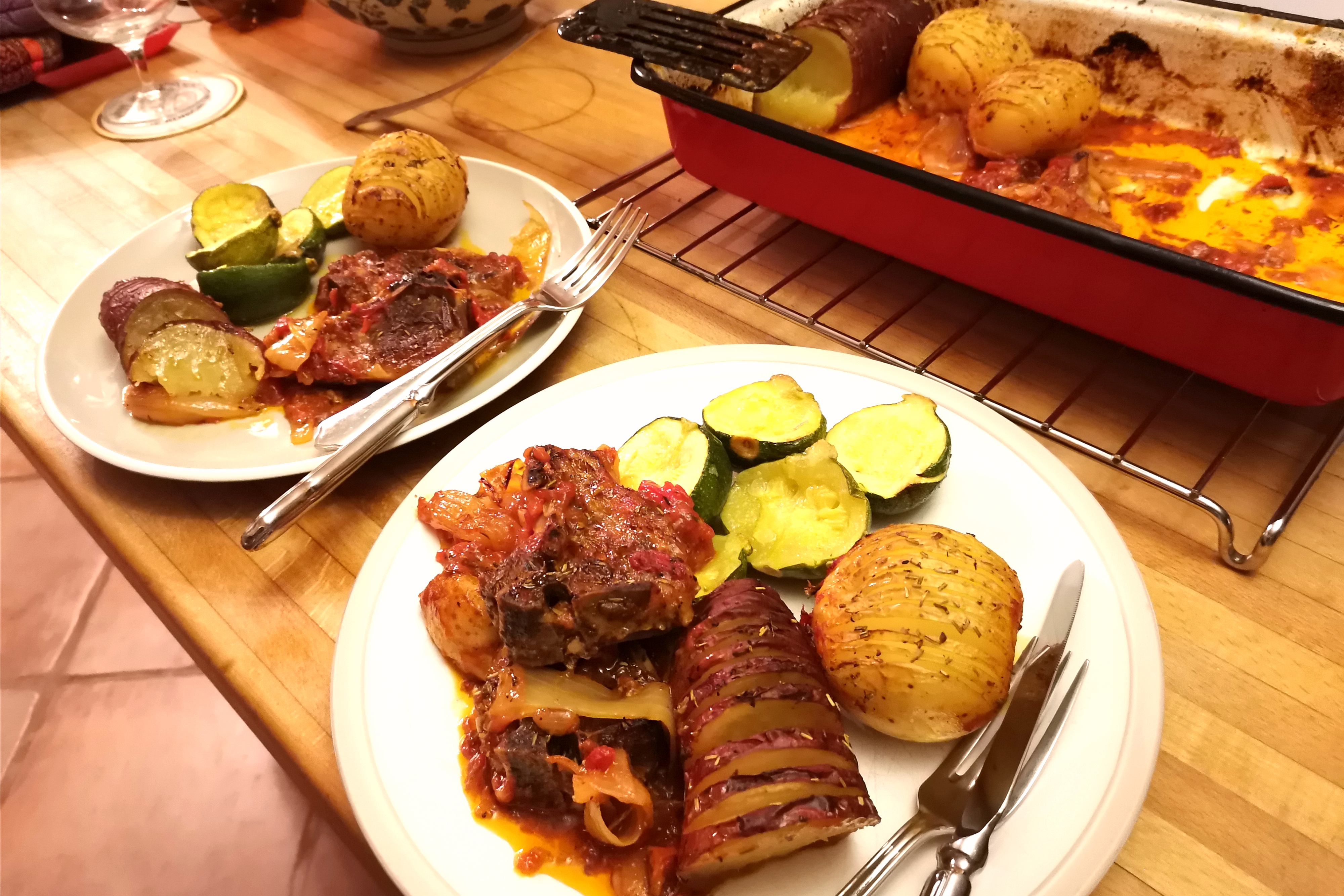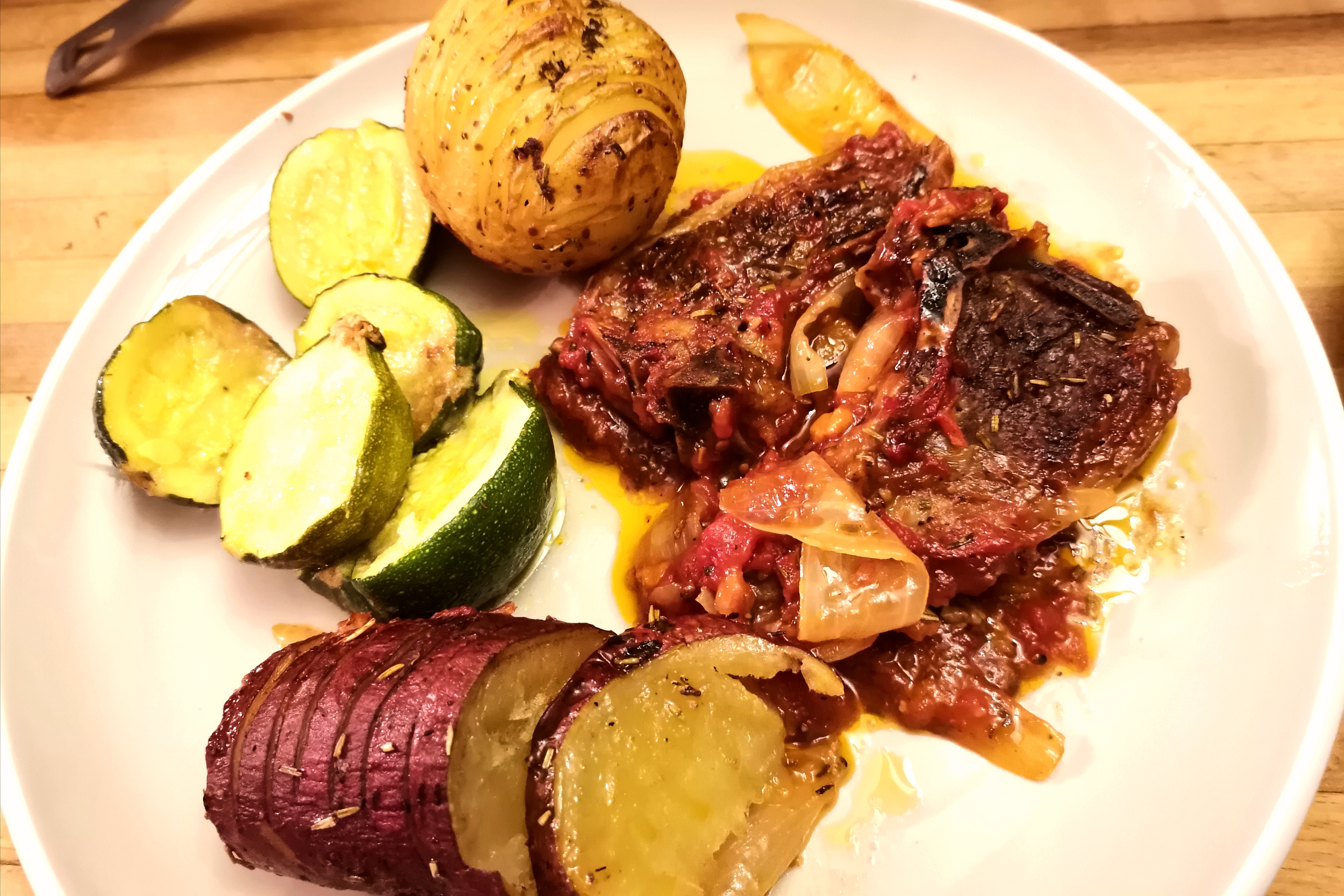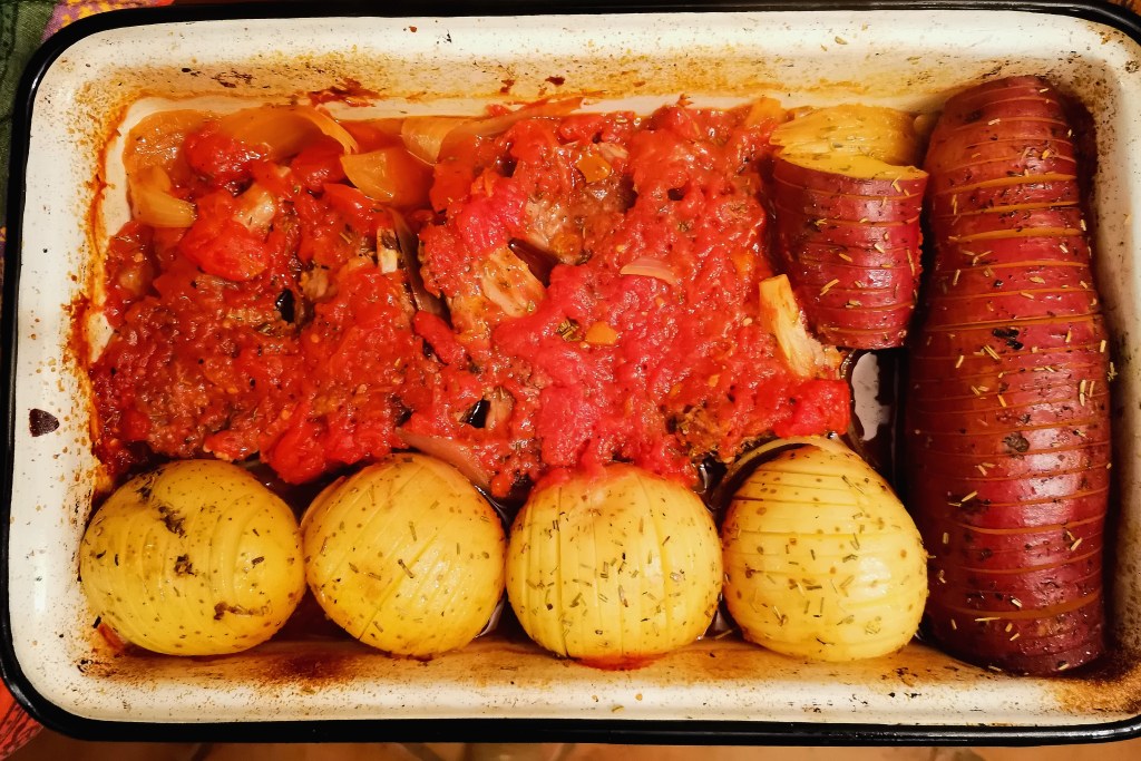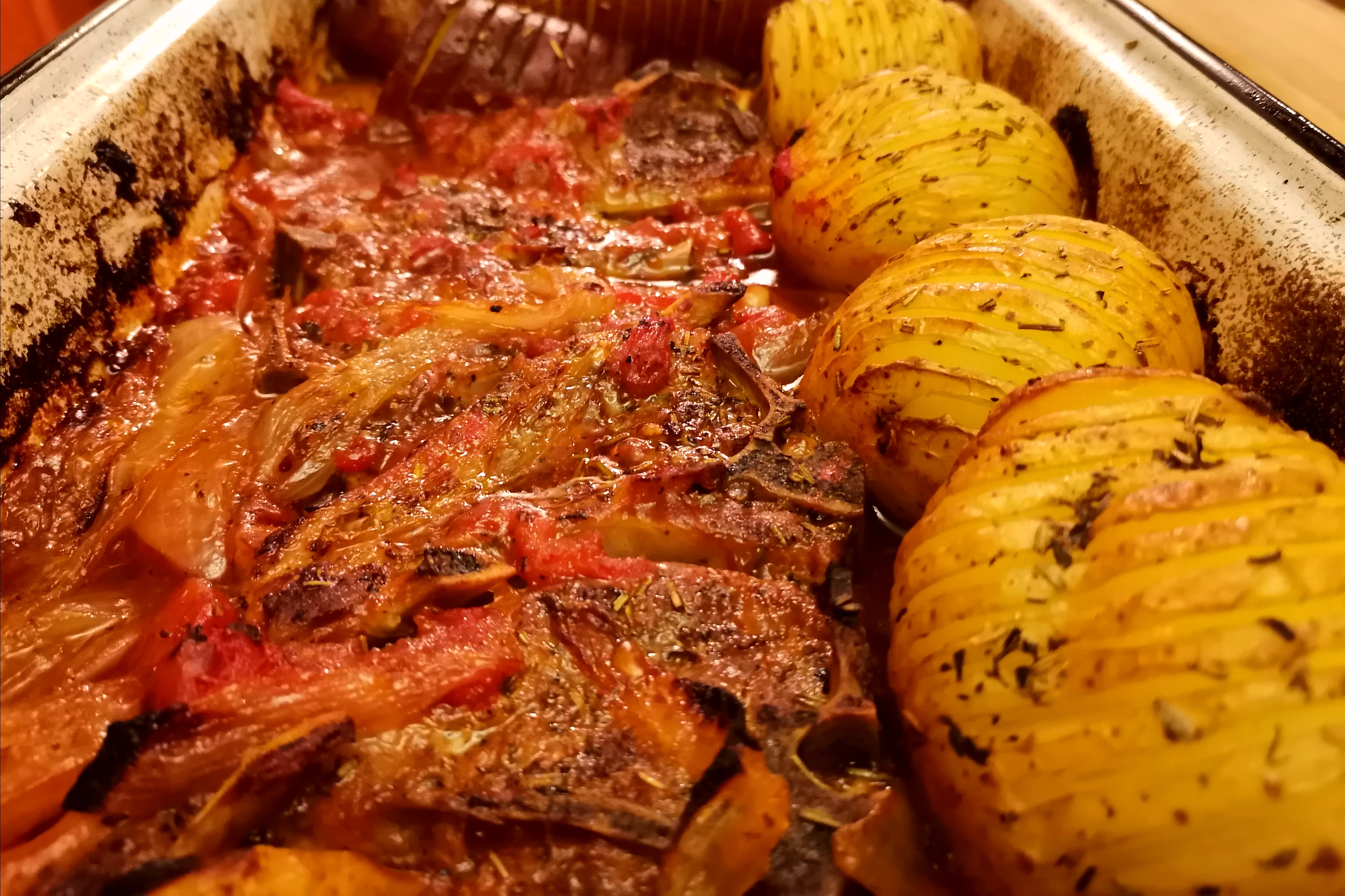 Lamb Chops in Tomato Sauce with Hasselback Veg