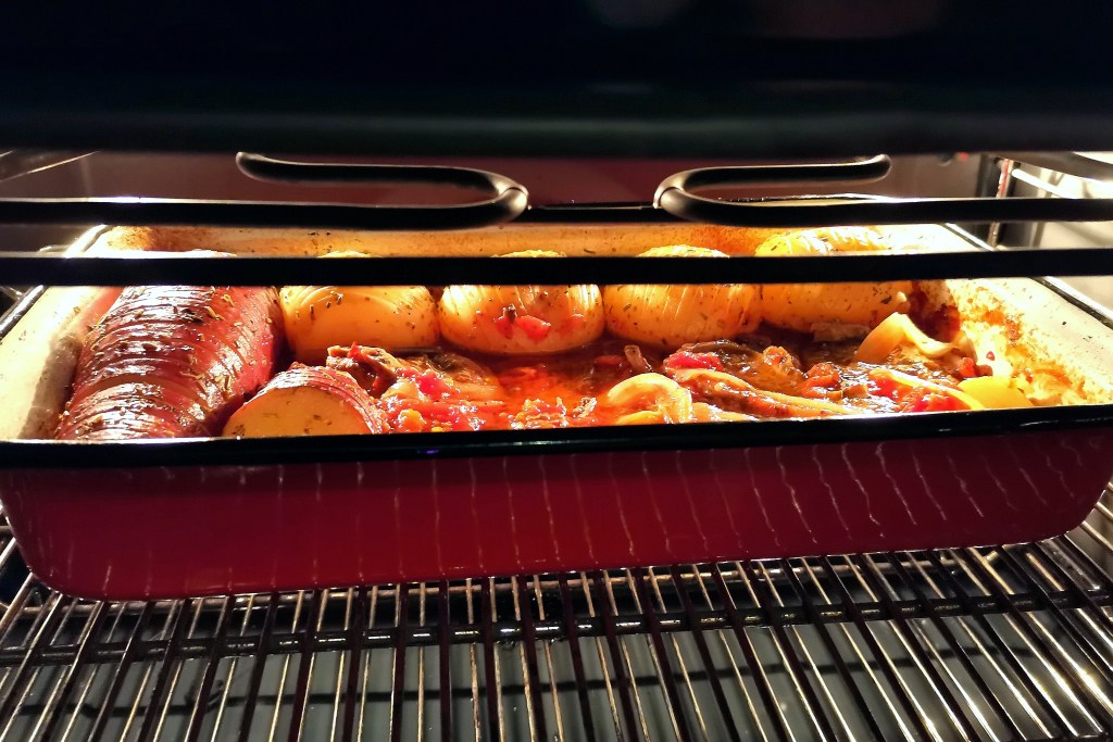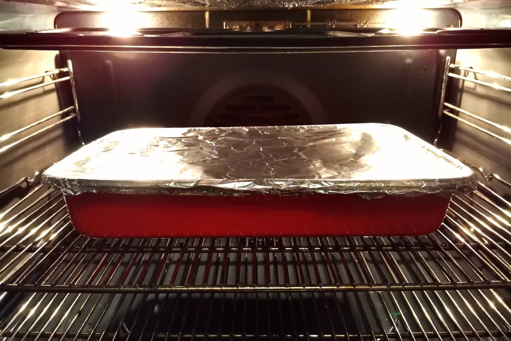 - Cover the dish with tin foil and roast at 180°C for 1 hour.