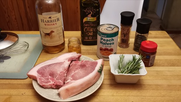 - Once the peaches are nice and golden, place the pork chops back in the pan along with the crackling. Pour the whisky into the pan and set alight with a match to flambé your dish. Serve immediately.