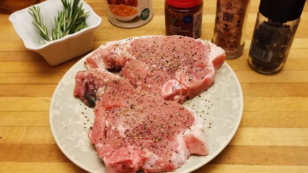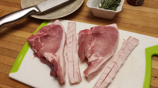 - 2 pork chops with rind (250 g each)