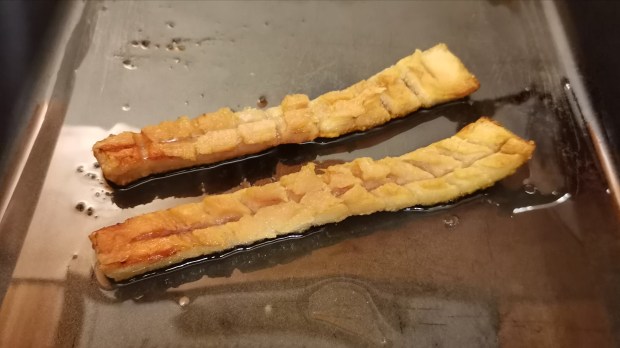 - Place the rinds fat-side down on a baking tray and place it under the hot grill for 5 to 7 min to crisp into crackling. Once done, remove and set aside.