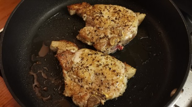 Once the peaches are nice and golden, place the pork chops back in the pan along with the crackling.