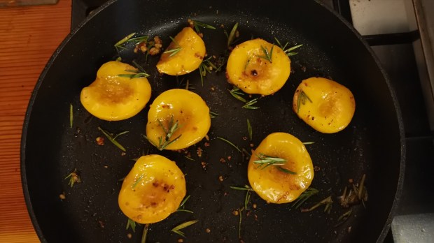 - Strip the rosemary leaves from the stalks and place them in the hot pan with olive oil. Add the garlic & chilli and drained peaches. Stir often so the garlic doesn’t burn.