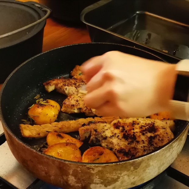 I frequently make pork chops in the oven, but this stovetop recipe is something special. I don’t know if it’s the thrill of the flambé or whether it’s the sweet, charred peaches that gives it its edge. Whatever it is, it works for me.