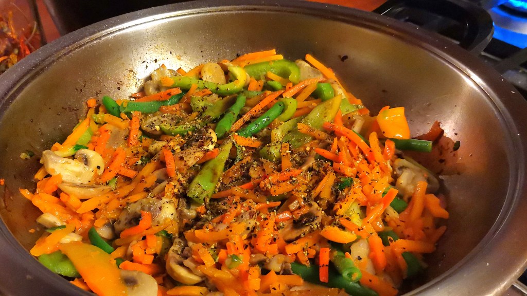 • 500 g julienne stir-fry veggies (green and red sweet bell peppers, carrots, courgettes, onion)