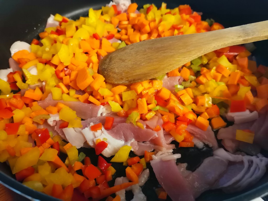 - Sauté the bacon, carrots, celery, peppers, and garlic in olive oil. Tip: Add the garlic halfway through to avoid burning it.