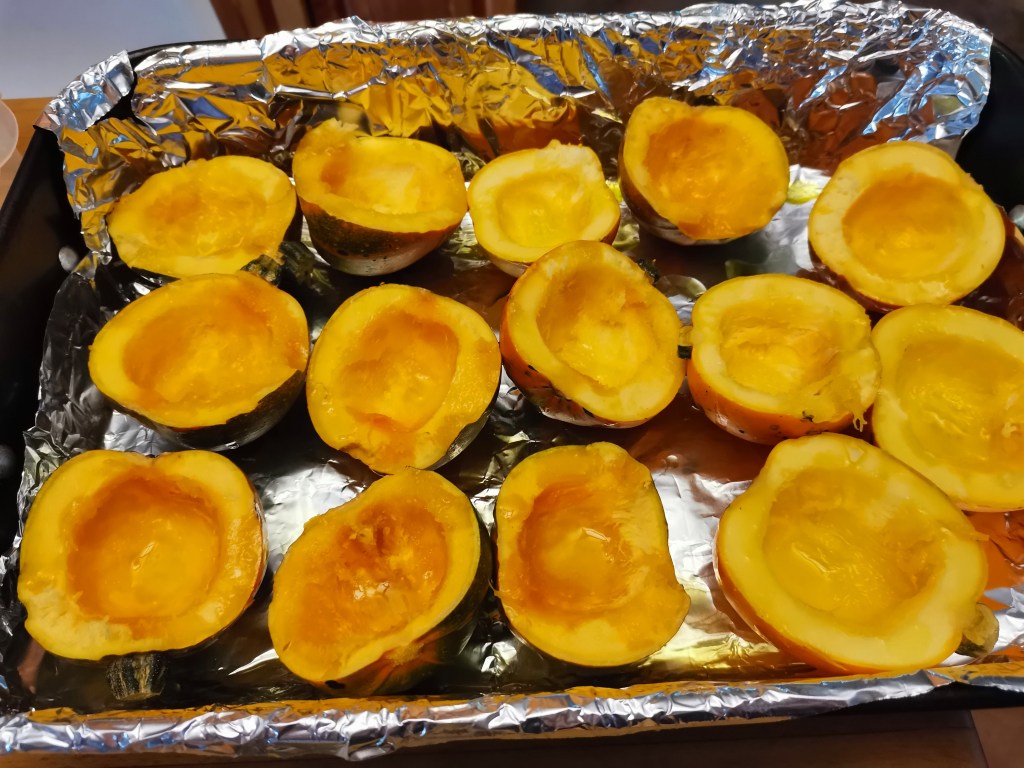 - While the stuffing is cooking, halve your squashes and place them in an oven-proof dish. Drizzle with olive oil and pop them into a 180°C oven with the grill/broiler on for 10 mins.