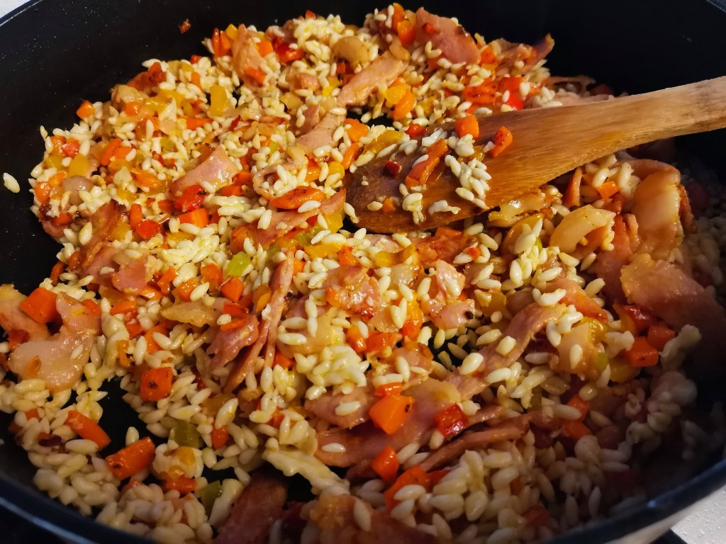 - Once the bacon has crisped up and the carrots have softened, add the rice to the pan.