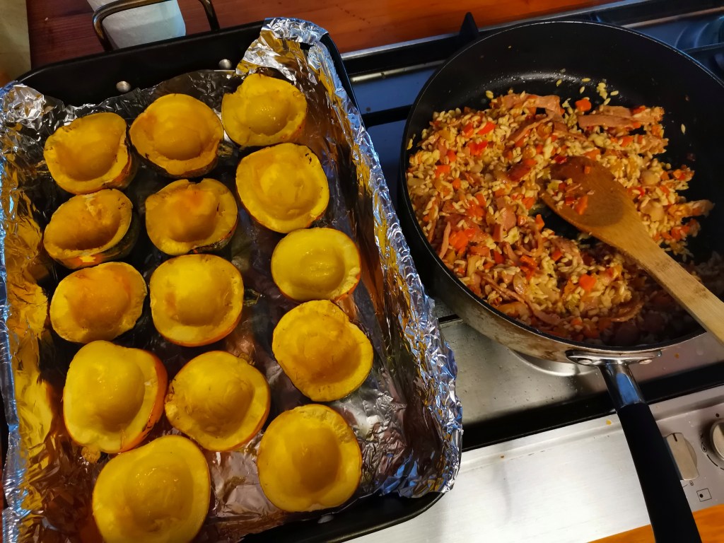 Scrumptious stuffed squashes that are great as a main or side dish. The filling is utterly moreish with flavoured rice, bacon and bits of veg.